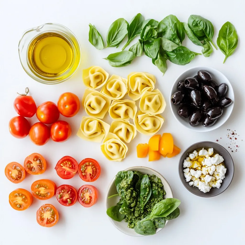 To make a vibrant pesto tortellini pasta salad, gather these simple ingredients: