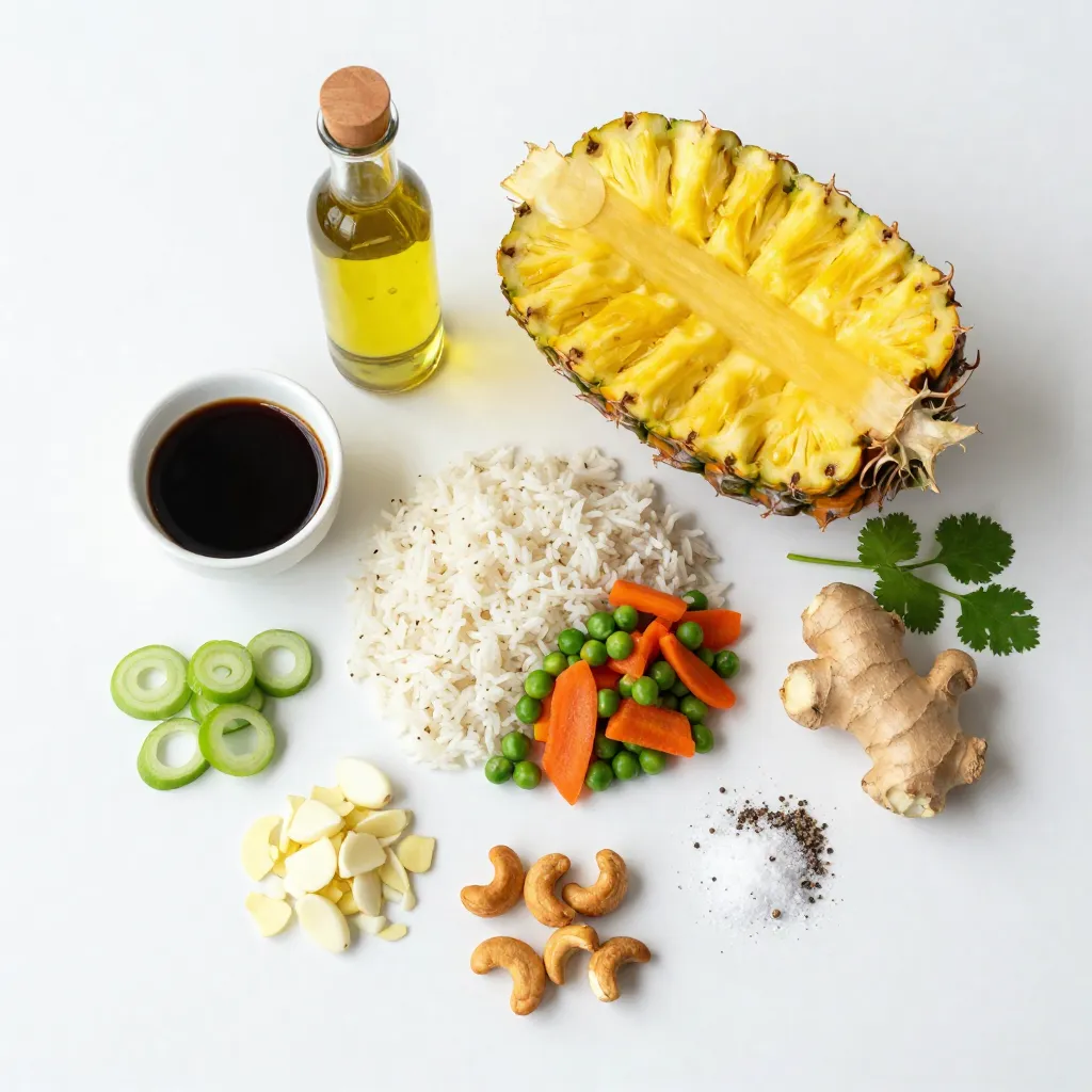 - Fresh produce: You need 1 ripe pineapple, peeled, cored, and cut into small pieces. This gives a sweet and tangy flavor. Add 1 cup of mixed vegetables. I like peas, diced carrots, and chopped bell peppers. They add color and crunch. You will also need 1 onion, finely diced, and 2 cloves of minced garlic. Lastly, use 1 teaspoon of freshly grated ginger for a zing.