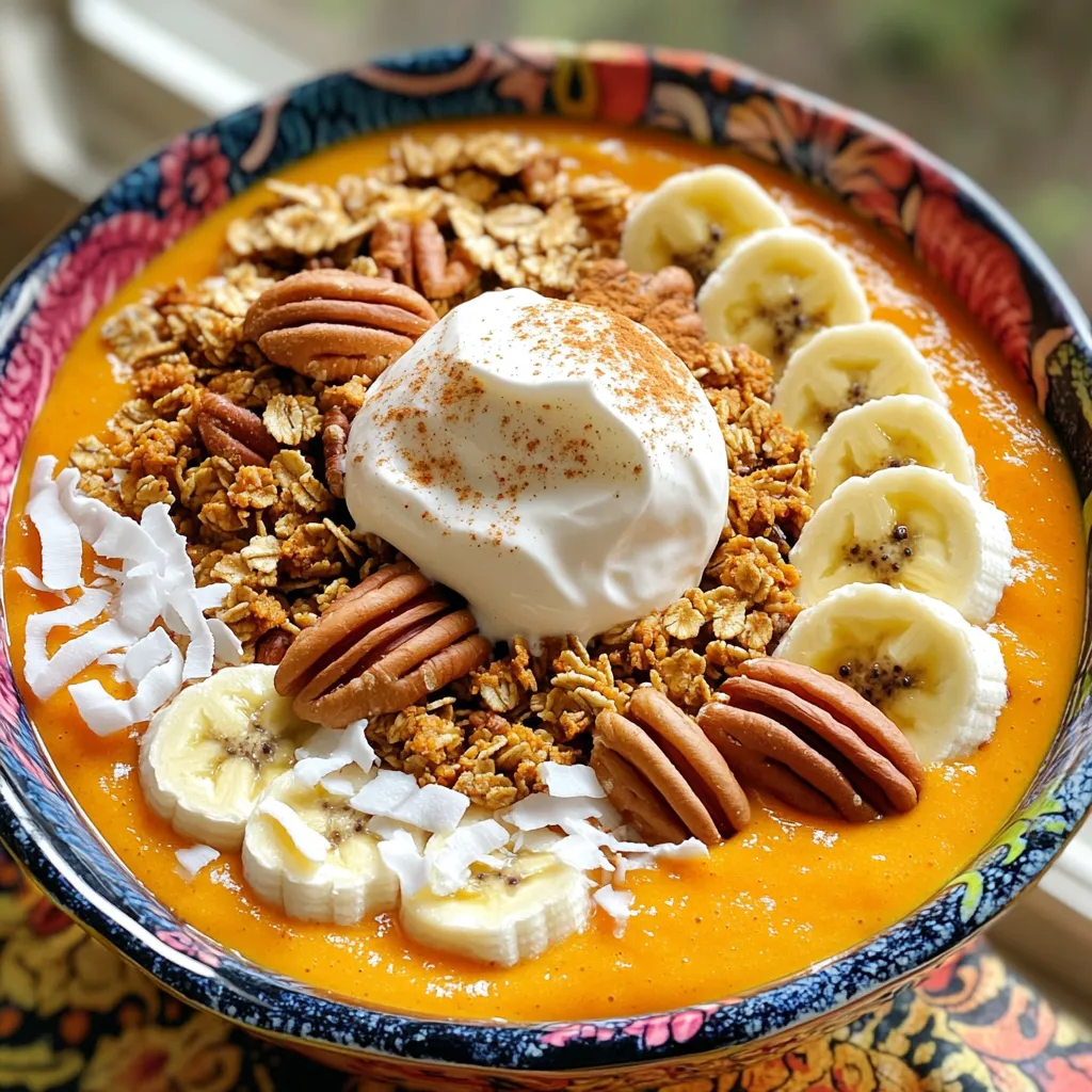 - 1 cup pumpkin puree - 1 frozen banana - 1/2 cup Greek yogurt - 1/2 cup milk (your choice of dairy or non-dairy alternative) - 2 tablespoons maple syrup (feel free to adjust for sweetness) - 1 teaspoon vanilla extract - 1 teaspoon pumpkin pie spice - 1/4 teaspoon ground cinnamon This pumpkin cheesecake smoothie bowl uses simple, wholesome ingredients. Pumpkin puree adds creaminess and flavor. The frozen banana gives the bowl a nice chill and sweetness. Greek yogurt boosts the protein and makes it rich. Milk, whether dairy or non-dairy, creates the perfect texture. Maple syrup sweetens the blend. You can adjust the amount based on your taste. Vanilla extract adds a lovely aroma. Pumpkin pie spice and ground cinnamon bring warmth and depth to every bite. The mix of these ingredients creates a delightful and cozy flavor. - Granola - Chopped pecans - Sliced fresh bananas - Coconut flakes - Whipped cream Toppings make this smoothie bowl even more fun! Granola adds crunch and texture. Chopped pecans give a nice nutty flavor. Sliced bananas bring freshness and extra sweetness. Coconut flakes add a tropical touch. A dollop of whipped cream finishes it off, making it feel like a treat. You can choose your favorites or mix and match for variety. - In a blender, combine these ingredients: - 1 cup pumpkin puree - 1 frozen banana - 1/2 cup Greek yogurt - 1/2 cup milk (your choice) - 2 tablespoons maple syrup - 1 teaspoon vanilla extract - 1 teaspoon pumpkin pie spice - 1/4 teaspoon ground cinnamon Blend them all together until smooth and creamy. If it is too thick, add more milk to get the right texture. Pour your blended mixture into a bowl. To make it look nice, use a spoon to create swirls on top. Now comes the fun part! Top your smoothie bowl with: - A generous handful of granola - Chopped pecans - Sliced fresh bananas - Coconut flakes Finish it all off with a delightful dollop of whipped cream. Enjoy the beautiful colors and flavors! To make your smoothie bowl creamy, you need the right mix. If it feels thick, add a splash of milk. This helps you reach a smooth texture. I often use dairy or almond milk for the best results. Frozen bananas are magic here. They add creaminess and chill without ice. Just peel, slice, and freeze the banana ahead of time. This will make your smoothie bowl super delightful. First, serve your smoothie in a bright bowl. It makes the colors pop! Use a spoon to create a swirl on top. This adds a nice touch and makes it look fancy. For garnishing, sprinkle pumpkin pie spice on top. It gives an extra flavor kick. You can also arrange toppings like granola and nuts in fun patterns. This makes every bite exciting. You can adjust the sweetness to fit your taste. If you want it sweeter, add more maple syrup. Start with two tablespoons, then taste and add more if needed. For toppings, feel free to mix things up. Try fresh berries for a fruity twist or swap pecans for almonds. You can even add a scoop of nut butter for extra richness. This keeps your smoothie bowl fresh and fun! {{image_4}} You can make your pumpkin cheesecake smoothie bowl even better! Try adding chocolate or peanut butter. A spoonful of cocoa powder gives a rich taste. It blends well with the pumpkin. Peanut butter adds creaminess and a nutty flavor. It pairs nicely with the sweet notes. You can also mix in other fruits. Consider using apples or pears for a fresh twist. They add a bright taste that complements pumpkin. You can even use berries for a tart kick. These fruits add color and texture to your bowl. If you want a vegan option, swap Greek yogurt for coconut yogurt. Use almond, soy, or oat milk instead of dairy milk. These changes keep the bowl creamy and delicious. For a low-sugar version, reduce or skip the maple syrup. Instead, try sweetening with ripe bananas or a few dates. They add natural sweetness without extra sugar. You can make your smoothie bowl festive for the holidays! Add cinnamon, nutmeg, or even a splash of eggnog. These flavors bring warmth and cheer to your dish. In summer, switch out pumpkin for fresh peaches or mangoes. This change keeps things light and refreshing. You can enjoy a seasonal twist while keeping the creamy texture. To keep your pumpkin cheesecake smoothie bowl fresh, store any leftovers in an airtight container. This helps prevent spoilage. You can refrigerate it for up to two days. If you notice any changes in smell or color, it’s best to toss it. If you want to save some for later, freezing works well. Pour the smoothie into freezer-safe containers. Leave some space at the top for expansion. You can freeze it for up to a month. When ready to enjoy, let it thaw overnight in the fridge. If you're in a hurry, place it in warm water for a quick thaw. Make mornings easier by prepping ingredients in advance. You can mix the dry ingredients and store them in a jar. Slice the banana and keep it in the fridge. When you want a smoothie bowl, just blend everything together. This saves time and gets you a tasty breakfast fast! A Pumpkin Cheesecake Smoothie Bowl is a tasty treat. It blends pumpkin puree, banana, and yogurt into a creamy mix. The flavors are warm and sweet, thanks to maple syrup and pumpkin pie spice. This bowl feels like dessert but is healthy enough for breakfast. The toppings, like granola and pecans, add a nice crunch. Each spoonful tastes like fall, making it perfect for any pumpkin lover. You can easily make this smoothie bowl without dairy. Instead of Greek yogurt, use coconut yogurt or almond yogurt. For milk, try almond milk, oat milk, or coconut milk. These options keep the taste rich and creamy without dairy. You won’t miss the dairy at all! Yes, you can use fresh pumpkin. First, cook the pumpkin until it's soft. Cut it into pieces and steam or roast it. After cooking, scoop out the flesh and blend it until smooth. Fresh pumpkin may taste a bit different but will still be great. It adds a nice, fresh flavor to your smoothie bowl. Just make sure it'