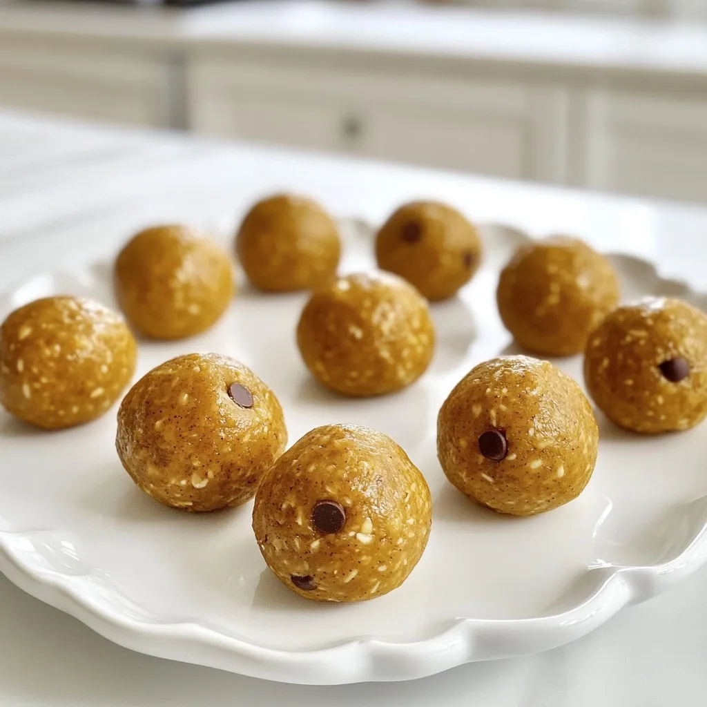 - 1 cup rolled oats - 1/2 cup nut butter (almond or peanut) - 1/2 cup pumpkin puree (fresh or canned) - 1/4 cup honey or maple syrup - 1 teaspoon vanilla extract - 1 teaspoon pumpkin spice blend (or homemade) - 1/4 teaspoon salt - 1/2 cup mini chocolate chips (optional) - 1/4 cup flaxseeds or chia seeds Each ingredient plays a key role. Rolled oats give a great base. They add fiber and texture. Nut butter adds creaminess and protein. I love almond or peanut for their rich taste. Pumpkin puree brings moisture and flavor. It’s also packed with vitamins. Honey or maple syrup gives natural sweetness. This is perfect for energy. Vanilla extract boosts the flavor. Pumpkin spice blend adds warmth and depth. You can make your own with cinnamon, nutmeg, and ginger. A pinch of salt enhances all flavors. Mini chocolate chips are optional but recommended. They add a sweet surprise. Flaxseeds or chia seeds bring crunch and nutrients. This mix is not just tasty; it’s good for you too! These energy balls are great for a quick snack. You can enjoy them anytime. {{ingredient_image_2}} In a large bowl, add the rolled oats, nut butter, pumpkin puree, honey, and vanilla extract. Mix these ingredients well with a spatula or spoon. Keep mixing until everything is blended together and forms a thick mixture. Next, sprinkle in the pumpkin spice and salt. Stir the mixture again to ensure the spices spread evenly. This step adds a warm flavor to your energy balls, making them taste just like fall! Now, it’s time for the fun part! If you want, gently fold in the mini chocolate chips and the flaxseeds or chia seeds. This will give your energy balls a nice crunch and boost their nutrition. Using your hands, scoop out some mixture and roll it into small balls, about one inch in size. Place each ball on a baking sheet lined with parchment paper. Make sure to leave space between them so they don’t stick together. After shaping all the balls, put the baking sheet in the refrigerator. Let them chill for at least 30 minutes. Chilling helps the energy balls firm up, making them easier to enjoy later. Once they are chilled, you can eat them right away! If you want to save some for later, store them in an airtight container in the fridge. They will stay fresh for up to one week, making them a great snack option! To get the best texture, mix the ingredients well. Start with a large bowl. Use a spatula to blend the rolled oats, nut butter, pumpkin puree, honey, and vanilla. Make sure everything combines into a smooth mixture. This step helps all the flavors blend. You can change the sweetness to fit your taste. If you want it sweeter, add more honey or maple syrup. Start with the amount in the recipe. Taste the mixture and adjust as needed. This way, you can find the perfect level of sweetness for your energy balls. Chilling is key to a great texture. Refrigerate the energy balls for at least 30 minutes. This helps them firm up nicely. If you like them firmer, chill them longer. Just remember, the longer they chill, the easier they are to handle! Pro Tips Use Fresh Pumpkin: For the best flavor, consider using fresh pumpkin puree made from roasted pumpkins instead of canned. It gives your energy balls a vibrant taste! Experiment with Nut Butters: Feel free to mix different nut butters, like cashew or sunflower seed butter, to create unique flavors and textures in your energy balls. Chill for Better Texture: Don’t skip the chilling step! Allowing the energy balls to set in the refrigerator not only firms them up but also enhances the flavors as they meld together. Add Seeds for Extra Crunch: Incorporating various seeds, such as pumpkin or sunflower seeds, can add an extra crunch and boost the nutritional value of your energy balls. {{image_4}} You can easily change the taste of your pumpkin spice energy balls. Try using other spices. Cinnamon adds warmth. Nutmeg brings a sweet edge. Ginger gives a slight zing. Mix and match these spices to create your unique flavor profile. This way, every batch can taste a bit different! Choosing nut butter can change the energy balls' taste and texture. Almond butter has a mild flavor and is rich in healthy fats. Peanut butter offers a bolder taste and creaminess. You could even try cashew butter for a sweet note. Each nut butter has its own benefits, so pick one that you love! You can make these energy balls fit different diets. For a gluten-free version, use certified gluten-free oats. If you want to make them vegan, swap honey for maple syrup. These simple changes let everyone enjoy this tasty snack, no matter their dietary needs! To keep your pumpkin spice energy balls fresh, use an airtight container. This helps prevent air from spoiling them. Store the container in your refrigerator. This cool space keeps the energy balls firm and tasty. These delicious energy balls last about one week when stored properly. After that, they may lose their flavor and texture. Check for any signs of spoilage, like an off smell or change in color. For longer storage, freeze the energy balls. Place them in a single layer on a baking sheet. Once frozen, move them to an airtight container or freezer bag. They can last up to three months in the freezer. When you're ready to enjoy them, simply thaw at room temperature. Pumpkin spice energy balls last about one week if stored in the fridge. Keep them in an airtight container. Look for signs of spoilage, like a strange smell or mold. If you see or smell anything off, it’s best to toss them. Yes, you can make these energy balls nut-free! Use sunflower seed butter or soy nut butter instead of nut butter. Both options give a rich flavor and nice texture. These swaps keep the energy balls tasty and safe for those with nut allergies. If you don’t have pumpkin puree, you can use applesauce or mashed bananas. Both options add moisture and sweetness. You can also try using sweet potato puree for a different flavor. Each substitute will give a unique twist to 