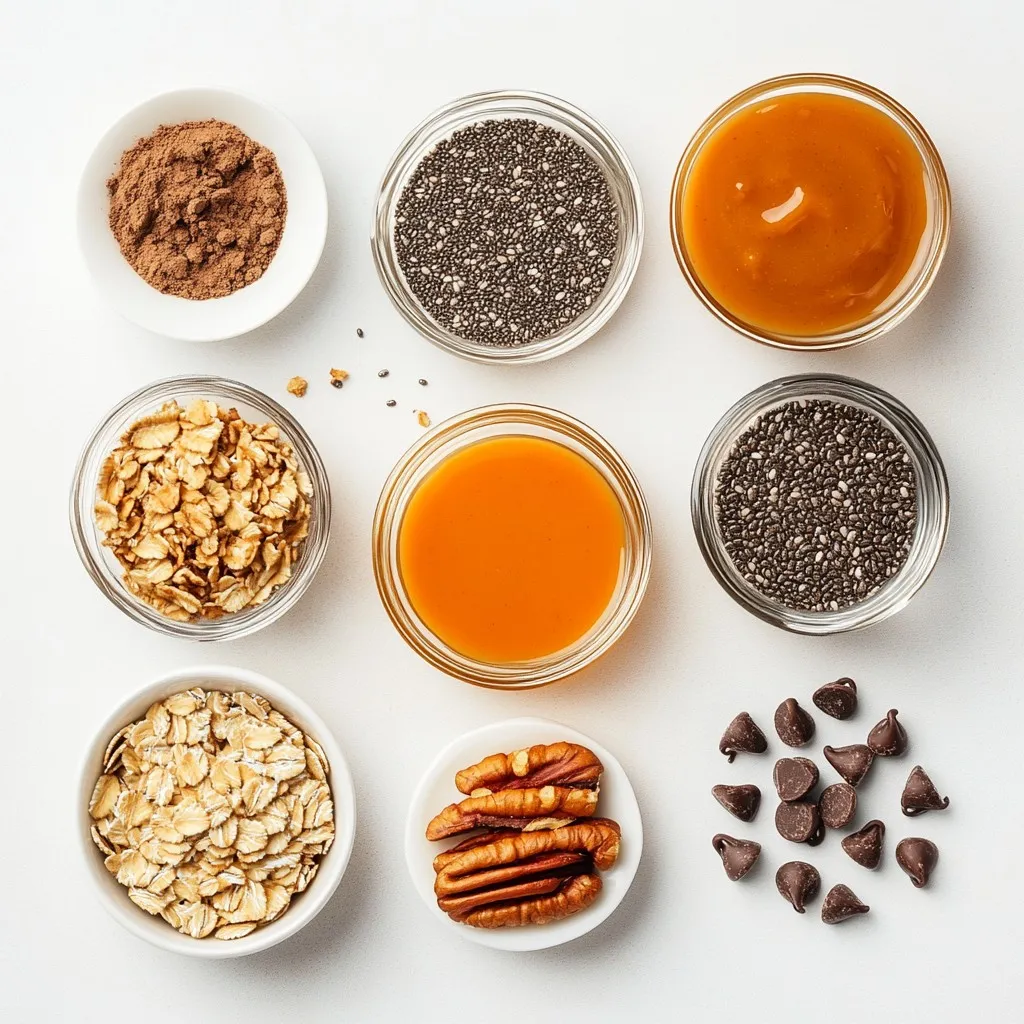 Rolled oats give a hearty base. Pumpkin puree offers moisture and a rich flavor. Nut butter adds creaminess and protein. Honey or maple syrup brings sweetness. Pumpkin pie spice infuses that classic fall taste. Vanilla extract enhances all the flavors. Chia seeds boost nutrition and texture. Chopped nuts add crunch. Dark chocolate chips, though optional, provide a delightful treat.