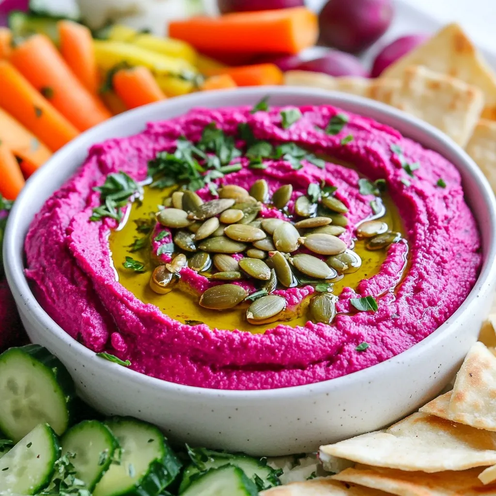 Transfer the beet hummus into a nice serving bowl. Drizzle some extra virgin olive oil over the top. For a fun touch, sprinkle roasted pumpkin seeds and fresh herbs like parsley or cilantro. Serve it alongside colorful veggies or crunchy pita chips for a beautiful platter. Enjoy this vibrant and tasty dip!