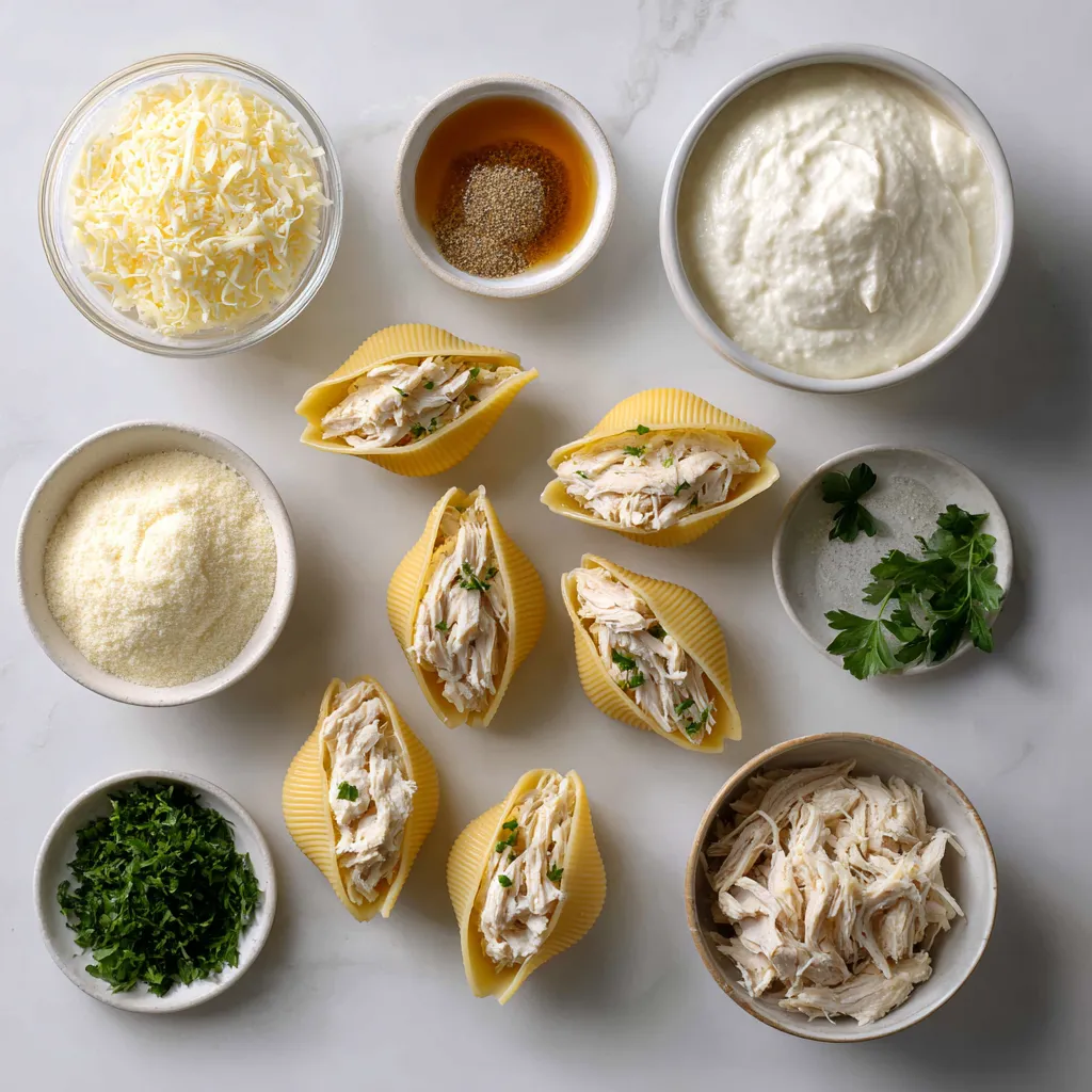 I love starting with the main ingredients for Chicken Alfredo Stuffed Shells. Jumbo pasta shells hold the creamy filling so well. You need cooked chicken, and it can be any kind you like. Shredded rotisserie chicken works great. The cheese mix brings creaminess and flavor. I use ricotta, mozzarella, and Parmesan for the best taste.