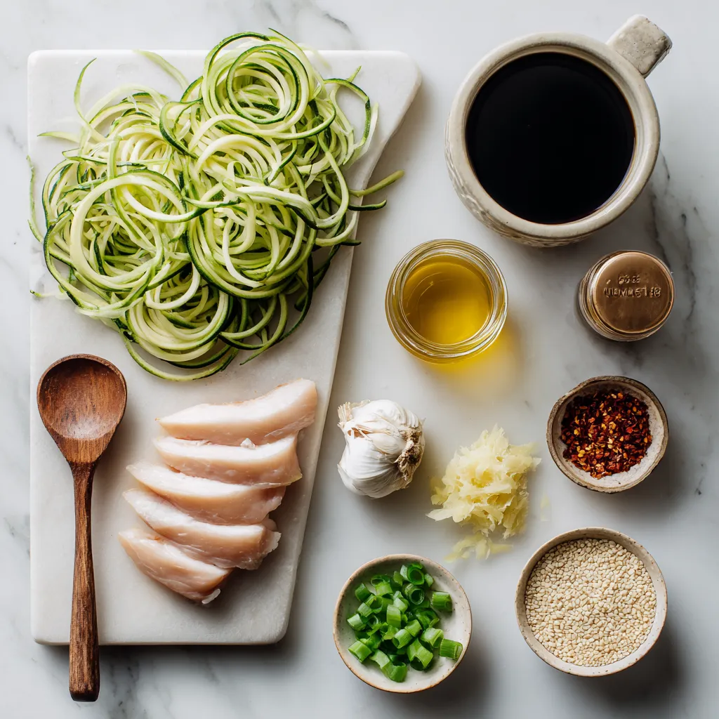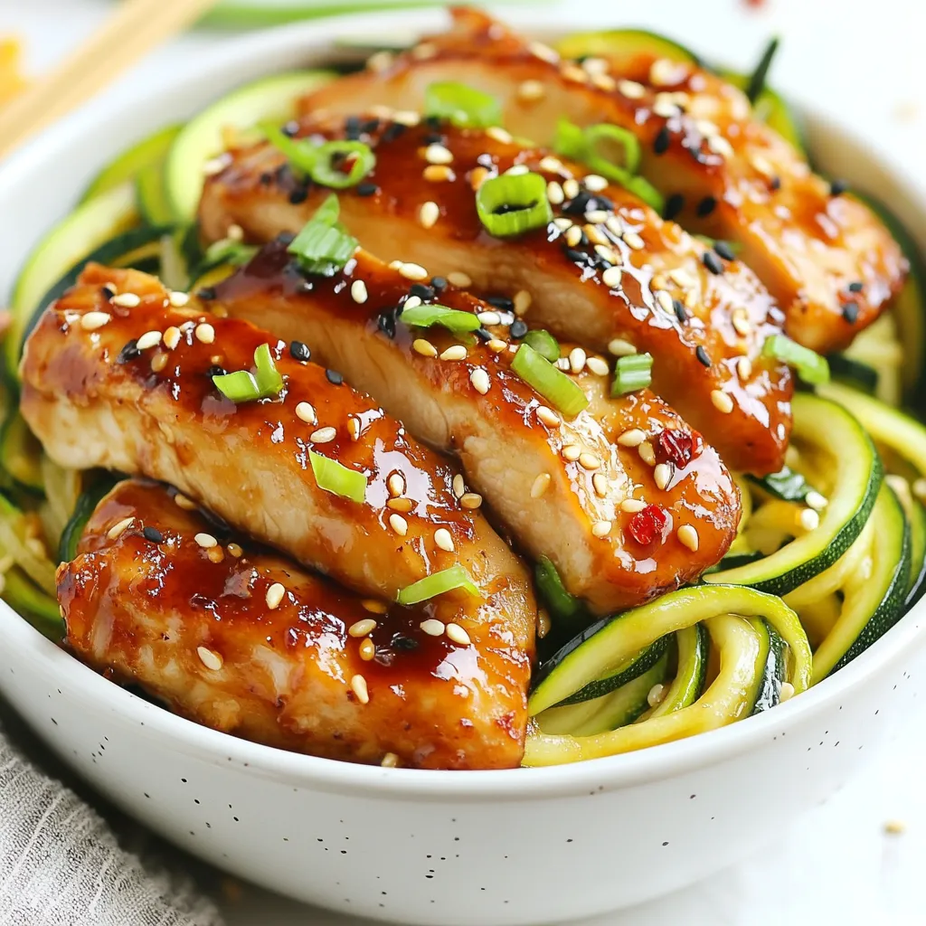 - 1 pound chicken breast, sliced into thin strips Chicken is the main protein in this dish. It adds flavor and keeps you full. I like to use fresh chicken breast for the best taste. Cutting it into thin strips helps it cook quickly and evenly. - 2 medium zucchinis, spiraled into noodle shapes Zucchini noodles, or zoodles, are a great low-carb option. They add texture and nutrients. Spiralizing zucchini is fun and easy. You can use a spiralizer or a vegetable peeler. Aim for thin noodles that mimic pasta. - 2 tablespoons sesame oil, divided - 2 tablespoons soy sauce (or tamari for a gluten-free option) - 1 tablespoon honey or agave syrup for sweetness - 2 cloves garlic, minced finely - 1 teaspoon fresh ginger, grated - 1/4 teaspoon red pepper flakes (optional for heat) - Salt and pepper, to taste These ingredients create a rich and tasty sauce. Sesame oil gives a nutty flavor. Soy sauce adds umami. Honey or agave adds a touch of sweetness. Garlic and ginger make the dish aromatic. Red pepper flakes can add a little kick if you like heat. - 1/4 cup green onions, sliced for garnish - 2 tablespoons sesame seeds, toasted for added crunch Garnishes add flavor and make the dish look nice. Green onions bring freshness and crunch. Toasted sesame seeds give a nutty taste and a bit of texture. They also make the meal look appealing on the plate. {{ingredient_image_2}} Start by marinating the chicken. Combine the sliced chicken breast in a bowl. Add soy sauce, honey, minced garlic, grated ginger, salt, and pepper. Mix well to coat the chicken. Let it sit for at least 15 minutes. This step boosts the flavor. Heat a large skillet over medium-high heat. Add 1 tablespoon of sesame oil. Once the oil shimmers, add the marinated chicken strips. Sauté the chicken for 5-7 minutes. Cook until it turns golden brown and is no longer pink. Then, remove it from the skillet and set it aside. In the same skillet, add the remaining tablespoon of sesame oil. Wait a moment for the oil to heat. Now, add the spiralized zucchini noodles. Sauté for 2-3 minutes. Use tongs to gently toss the noodles. They should be tender but still have a nice crunch. If you like heat, add red pepper flakes now. Return the cooked chicken to the skillet. Add it to the sautéed zucchini noodles. Gently toss everything together. Heat the mixture for another 2 minutes. Taste and adjust the seasoning with salt and pepper if needed. Once everything is well combined, transfer the sesame chicken zucchini noodles to a serving dish. For a stunning look, sprinkle sliced green onions and toasted sesame seeds on top. This adds color and crunch. Enjoy your meal! To make sure your chicken is juicy and tender, start by slicing it thin. Thin strips cook faster and stay moist. Marinate your chicken in soy sauce, honey, garlic, and ginger. Let it sit for at least 15 minutes. The marinade gives flavor and helps keep the chicken soft. When cooking, use medium-high heat. This will give your chicken a nice golden color. Cook it for 5-7 minutes, stirring often. Make sure it reaches 165°F to be safe. Spiralizing zucchini is fun and easy! You can use a spiralizer, a julienne peeler, or a box grater. A spiralizer is best for long noodles. Cut the ends off the zucchinis before you start. Hold the zucchini firmly and twist it to create long strands. Aim for thin noodles that cook quickly. If you don’t have a spiralizer, using a peeler works too. Just make flat ribbons instead. When cooking, don’t forget to keep an eye on them. They should be tender but still have a little crunch. You can change the flavors in this dish to fit your taste. If you like it sweeter, add more honey or agave syrup. For a spicy kick, toss in more red pepper flakes. If you want a saltier taste, add a bit more soy sauce. Always taste before serving. This helps you catch any flavor changes you want. You can also mix in other veggies like bell peppers or carrots for extra crunch and color. Experiment and find what you love! Pro Tips Marinate Longer for Better Flavor: If you have time, marinate the chicken for at least 30 minutes, or even overnight, to let the flavors penetrate deeply. Use a Spiralizer Efficiently: When spiralizing zucchinis, ensure they are firm and not overly ripe for the best noodle texture. Add More Vegetables: Feel free to toss in other vegetables like bell peppers or broccoli for added nutrition and color. Garnish with Fresh Herbs: Enhance the flavor by adding freshly chopped cilantro or basil as a garnish before serving. {{image_4}} You can switch out chicken for other proteins. Try shrimp or tofu for variety. Both cook quickly and add great flavor. If you like beef, use thinly sliced flank steak. Just remember to adjust cooking times. For a vegan version, replace chicken with tofu or tempeh. Use agave syrup instead of honey. You can also add more veggies like bell peppers or carrots. This keeps the dish colorful and nutritious. Feel free to play with the sauce. Try adding peanut butter for a creamy twist. A splash of rice vinegar can brighten the flavor. For a spicy kick, add sriracha or chili paste. Adjust the sweetness or saltiness to suit your taste. You can store your sesame chicken zucchini noodles in the fridge. Place them in an airtight container. Make sure they cool down first. This keeps the flavors fresh and prevents sogginess. They will stay good for about 3 to 4 days. Just reheat them in a pan or microwave when you are ready to eat. Freezing this dish is a great option if you want to save some for later. Use a freezer-safe container or a resealable bag. Be sure to remove as much air as possible. This helps prevent freezer burn. You can freeze the noodles and chicken for up to 2 months. When you're ready to enjoy them, just thaw them overnight in the fridge. Reheat in a skillet over medium heat. Add a splash of sesame oil to revive the dish. When stored properly, sesame chicken zucchini noodles can last a good while. In the fridge, they last 3 to 4 days. I