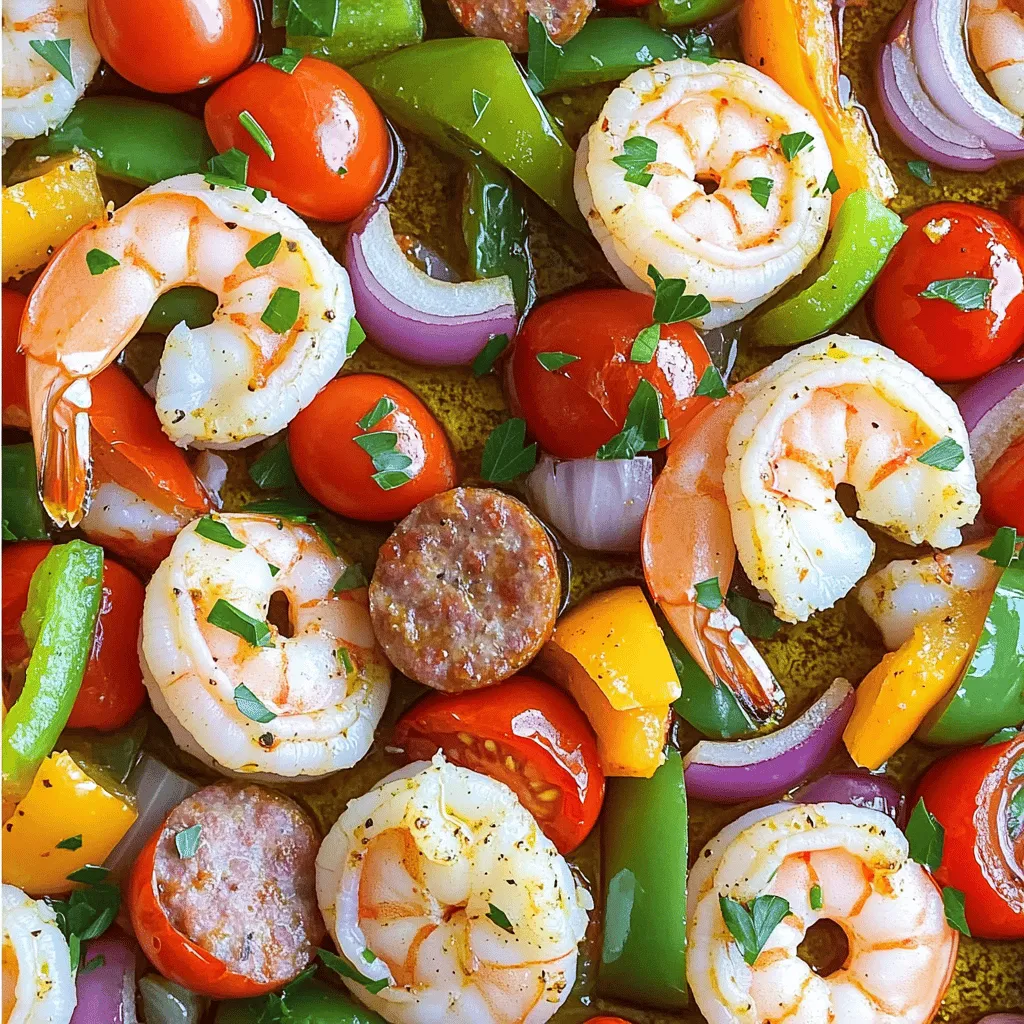- 1 pound large shrimp, peeled and deveined - 1 pound turkey sausage, sliced into half-inch rounds - 1 red bell pepper, chopped - 1 green bell pepper, chopped - 1 medium red onion, chopped - 2 cups cherry tomatoes, halved - 3 tablespoons extra-virgin olive oil - 2 tablespoons Cajun seasoning - 1 teaspoon garlic powder - Salt and freshly cracked black pepper, to taste - Fresh parsley, finely chopped for garnish Alternative ingredients You can swap turkey sausage for chicken sausage or a plant-based option. Try using shrimp with tails on for a nice look. Gluten-free options All the ingredients here are gluten-free. Always check the labels of your sausage and seasoning to be sure. Adjusting spice levels If you prefer less heat, use less Cajun seasoning. For more spice, add cayenne pepper or hot sauce. 1. Preheat your oven to 400°F (200°C). This hot temperature helps cook the shrimp and sausage well. 2. Line a large sheet pan with parchment paper. This makes cleanup easy. 3. In a big mixing bowl, add 1 pound of shrimp, 1 pound of turkey sausage, 1 red bell pepper, 1 green bell pepper, 1 medium red onion, and 2 cups of cherry tomatoes. 4. Drizzle 3 tablespoons of extra-virgin olive oil over the mix. 5. Add 2 tablespoons of Cajun seasoning, 1 teaspoon of garlic powder, salt, and pepper to taste. 6. Toss all items together. Make sure everything gets covered with oil and spices. 1. Spread the mixture evenly on the sheet pan. Lay it in a single layer for even cooking. 2. Place the pan in the oven and roast for about 15-20 minutes. The shrimp should turn opaque when done. 3. Stir the mixture halfway through cooking. This step ensures even roasting and flavor. 1. After taking the pan out of the oven, let it rest for a few minutes. 2. Garnish with fresh parsley. This adds color and brightness. 3. You can serve directly from the pan. It makes for a great family-style meal. 4. Pair it with crusty bread for a delightful meal experience. To get great shrimp, cook them until they turn opaque. This means they are done. It usually takes about 15 to 20 minutes in the oven. The shrimp should not feel soft or mushy. If they do, they are overcooked. Cook the turkey sausage until it is warm throughout. This will happen at the same time as the shrimp. Stir the mixture halfway through cooking for even heat. This helps both the shrimp and sausage cook well. Adjusting seasonings is key to making this dish your own. If you like it spicy, add more Cajun seasoning. For a milder taste, use less. Taste the mixture before cooking. This way, you can add more salt or pepper if needed. Using parchment paper is a smart choice. It keeps the food from sticking to the pan. It also makes cleanup much easier. You won’t have to scrub the pan hard after cooking. Just toss the paper when you are done. For a quick cleanup, gather all your tools before cooking. Keep a trash bowl nearby for scraps. This saves you time when you finish cooking. Prep your ingredients ahead of time. Chop the veggies and slice the sausage before you start. This makes everything flow smoothly when you cook. You will enjoy the cooking process more when you are prepared. {{image_4}} You can easily change this dish's flavor with simple swaps. Try using different types of sausage, like chicken or pork. Each type gives a new taste and texture. You can also add seasonal vegetables. For fall, use butternut squash. In spring, go for asparagus or snap peas. These veggies keep the dish fresh and interesting. If you want more heat, add different spices. Consider smoked paprika or cayenne pepper. You can also mix in a bit of hot sauce for a kick. Just remember to adjust the seasoning to your taste. These swaps let you customize the dish to fit your cravings. You don't have to stick to the sheet pan method. Grilling is a fun way to cook this dish. It gives your shrimp and sausage a smoky flavor. Just toss the seasoned ingredients on a grill. Cook until the shrimp are opaque and the sausage is heated through. A skillet version works well too. Heat a bit of olive oil in a large skillet. Add shrimp and sausage, then cook over medium heat. Stir often until everything is cooked. This method is quicker and still delicious. For a slow cooker adaptation, combine all ingredients in the slow cooker. Cook on low for 4-6 hours. This method allows the flavors to meld beautifully. You get a tender, flavorful meal without much effort. Each method keeps the meal tasty and fun! To keep your tasty sheet pan Cajun shrimp and turkey sausage fresh, follow these tips: - Refrigeration: Place leftover shrimp and sausage in an airtight container. Make sure to cool it to room temperature first. It can stay in the fridge for up to three days. - Freezing: For longer storage, you can freeze the dish. Use freezer-safe bags or containers. Remove as much air as possible. It can last for up to three months in the freezer. When it’s time to enjoy your leftovers, here are the best ways to reheat: - Oven: Preheat your oven to 350°F (175°C). Spread the shrimp and sausage on a baking sheet. Heat for about 10-15 minutes. This helps keep them juicy. - Microwave: Use a microwave-safe dish. Cover it loosely to avoid splatters. Heat for 1-2 minutes, checking every 30 seconds. To avoid rubbery shrimp, do not overheat. Shrimp cooks quickly, so keep an eye on it. Enjoy your meal! How long to cook shrimp on a sheet pan? You should cook shrimp for about 15 to 20 minutes. The shrimp will turn opaque when done. This shows they are cooked through and safe to eat. Can I use frozen shrimp for this recipe? Yes, you can use frozen shrimp. Just thaw them first before cooking. This keeps the shrimp tender and flavorful. What side dishes pair well with Cajun shrimp and sausage? Great sides are rice or crusty bread. You can also serve a fresh salad. These add nice contrast to the dish. How to adjust cooking time for larger shrimp? If you use larger shrimp, add a few extra minutes. Check them at around 20 minutes to see i