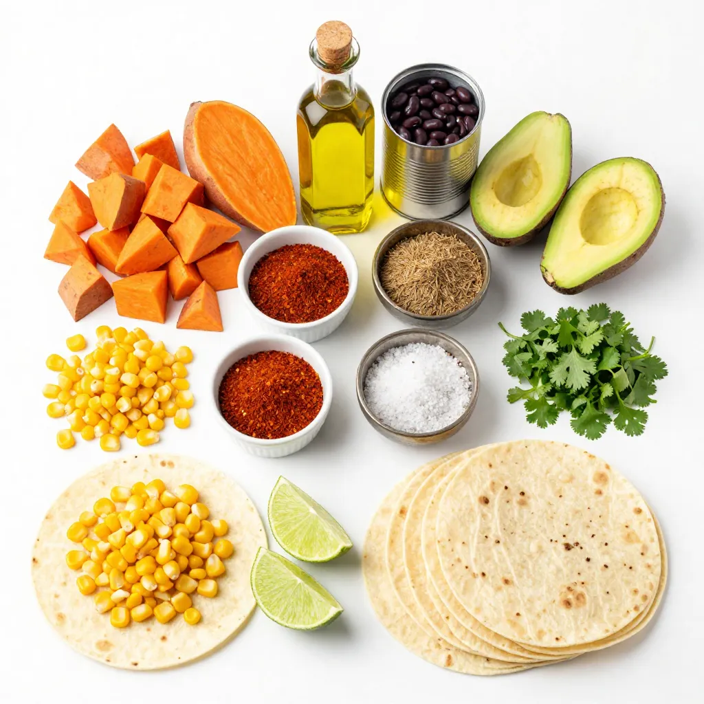 The sweet potatoes bring a soft texture and natural sweetness. Black beans add protein and earthiness. Corn gives a pop of color and sweetness. These main ingredients form a hearty base for your tacos.