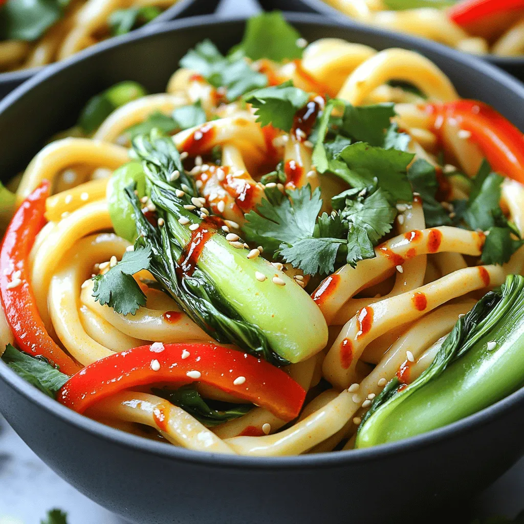 Udon noodles are thick, chewy, and full of flavor. They soak up sauce well. Chili crisp oil adds heat and crunch. It brings a unique taste to this dish. Soy sauce gives a savory depth. Sesame oil adds a nutty note. Rice vinegar brightens the flavors and balances the heat. Fresh garlic and ginger give a warm, aromatic base. Red bell pepper and bok choy add color and crunch. Spring onions lend freshness, while toasted sesame seeds add a nice texture. Finally, fresh cilantro is a must for a burst of flavor.