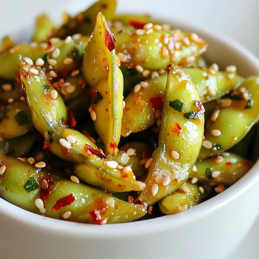 Next, sprinkle in 1 teaspoon of red pepper flakes. Sauté for another 30 seconds. This step brings out the heat and flavor. Now, add the cooked edamame to the skillet. Toss them gently so that they are well-coated in the garlic oil. Drizzle 2 tablespoons of low-sodium soy sauce and 1 tablespoon of toasted sesame oil over the edamame. Toss again, cooking for 2-3 minutes. This lets the flavors blend well. Finally, season with sea salt to taste. If you like, you can sprinkle toasted sesame seeds on top for a nice crunch before serving.