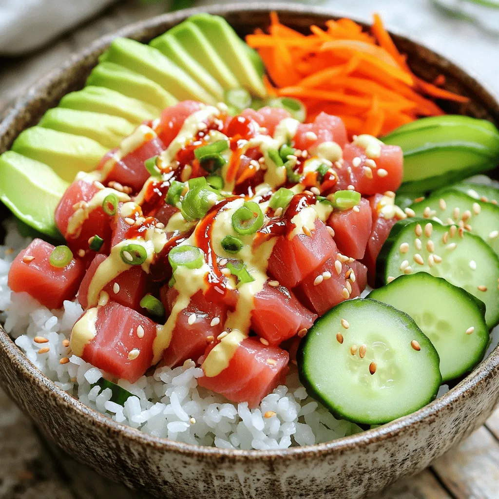 For a stunning presentation, arrange your toppings with care. Start with the sushi rice as a base. Then, add the spicy tuna on top. Use colorful vegetables like avocado, cucumber, and carrot for a bright look. Sprinkle green onions and sesame seeds on top for extra flair. Serve in beautiful bowls, and add a small dish of soy sauce on the side. This makes it feel like a restaurant experience at home.