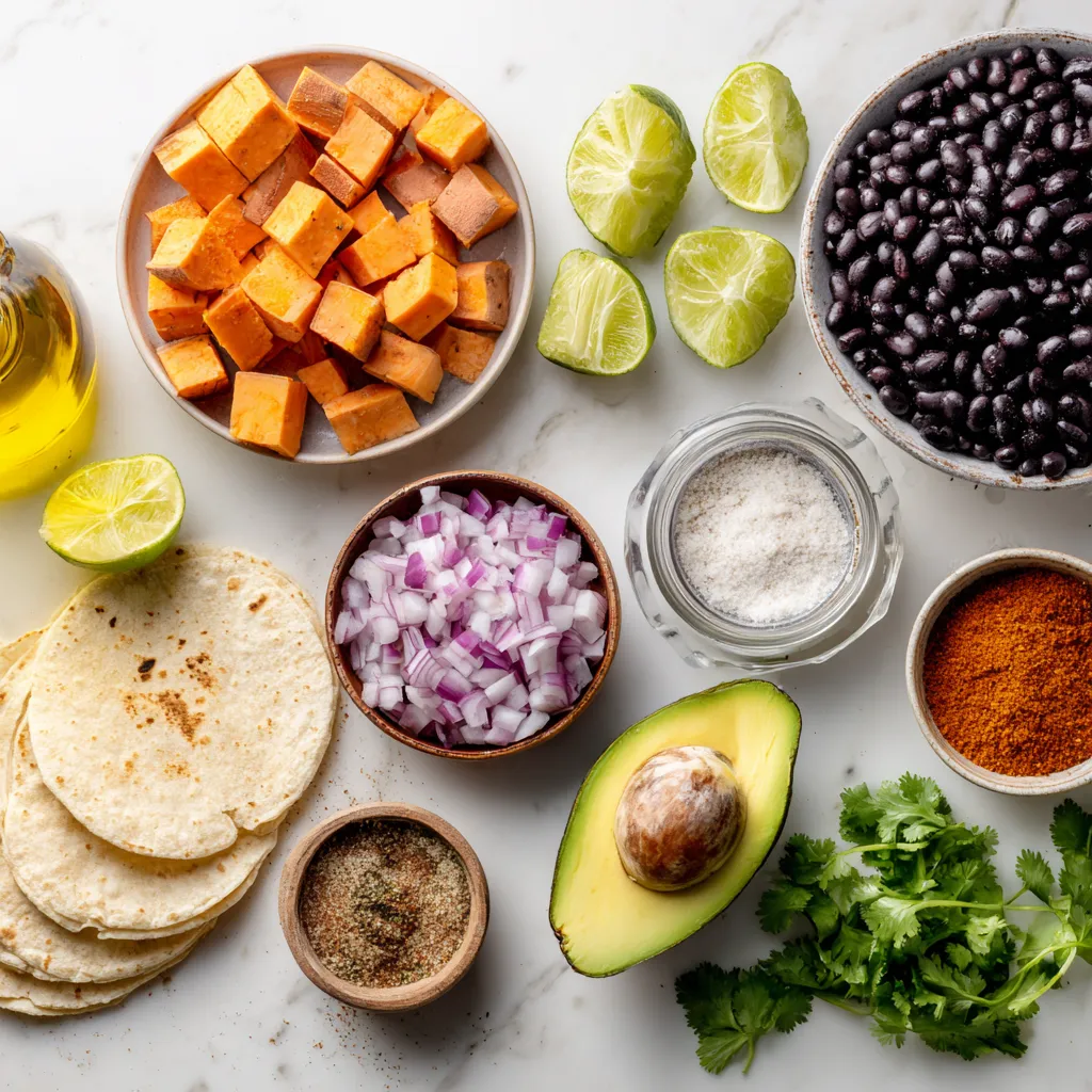 To make sweet potato black bean tacos, gather these ingredients:
