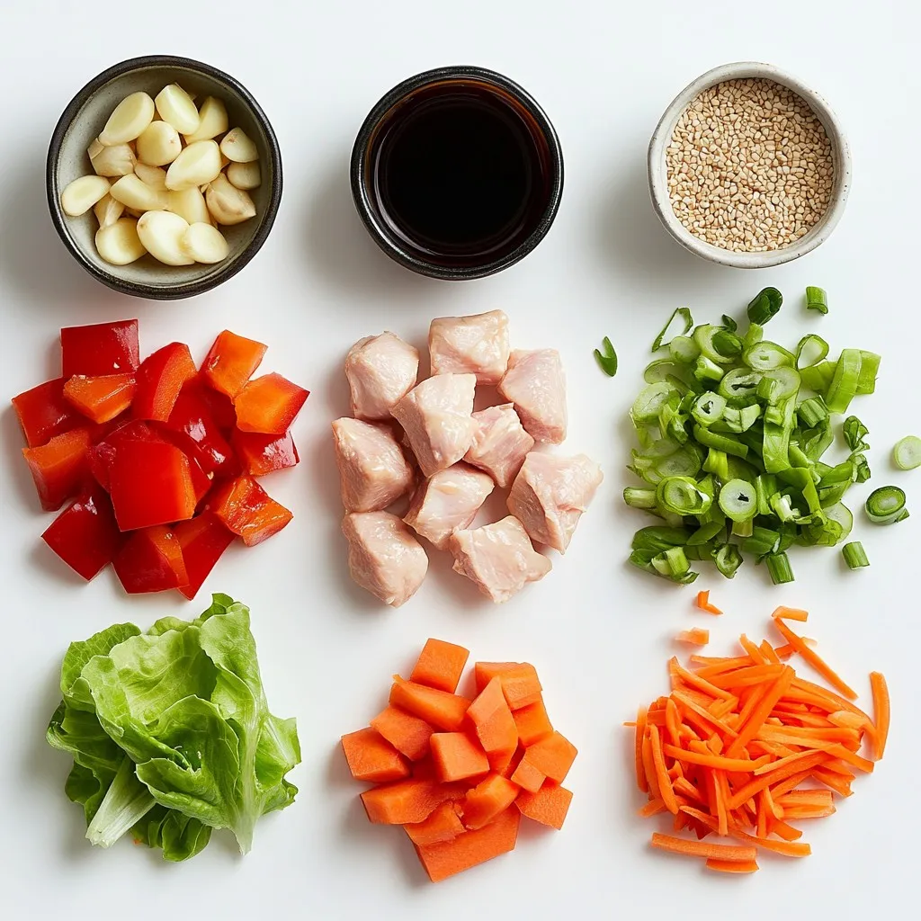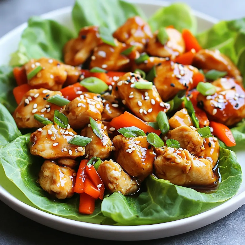 For tasty teriyaki chicken wraps, you need some key items: - 1 lb boneless, skinless chicken thighs, diced - 1/3 cup teriyaki sauce, store-bought or homemade - 1 tablespoon sesame oil - 1 tablespoon fresh ginger, minced - 2 garlic cloves, finely minced - 1 red bell pepper, diced - 1 medium carrot, shredded - 2 green onions, sliced - 1 tablespoon sesame seeds, toasted - 1 head of butter or romaine lettuce - Salt and freshly ground black pepper While the main ingredients shine, you can add extras for more flavor: - Chopped cilantro for freshness - Avocado slices for creaminess - Chopped nuts for extra crunch - Sriracha for a spicy kick Feel free to mix and match these options to make it your own! In this dish, the teriyaki sauce is the star. It brings a sweet and savory taste. The sesame oil adds a nice nutty flavor. You can adjust the salt and pepper to fit your taste. For a richer experience, try adding more ginger or garlic. This way, every bite bursts with flavor. {{ingredient_image_2}} Start with 1 pound of boneless, skinless chicken thighs. Cut them into small pieces. In a bowl, mix the chicken with 1/3 cup of teriyaki sauce, 1 tablespoon of minced ginger, and 2 minced garlic cloves. Stir well so each piece is coated. Let the chicken marinate for 15 minutes. This step brings out the flavors. Heat 1 tablespoon of sesame oil in a large skillet over medium heat. When the oil is hot, add the marinated chicken. Be sure to leave behind any extra marinade. Cook the chicken for 8 to 10 minutes. Stir it occasionally. Look for a nice brown color and make sure it reaches 165°F (75°C) inside. After cooking the chicken, add diced red bell pepper and shredded carrot. Sauté this mix for 3 to 4 minutes. This keeps the veggies crisp. Take the skillet off the heat. Fold in sliced green onions and toasted sesame seeds. Season with salt and black pepper to taste. To serve, use lettuce leaves as wraps. Spoon the chicken mix into each leaf and roll it up like a taco. Enjoy your tasty teriyaki chicken lettuce wraps! To make the best teriyaki chicken, start with a good marinade. Use 1/3 cup of teriyaki sauce. You can buy it or make your own. Add 1 tablespoon of minced ginger and 2 minced garlic cloves. This mix adds flavor and depth. Let the chicken marinate for at least 15 minutes. This time helps the meat absorb the flavors. If you have more time, try marinating for an hour for even better taste. Cooking chicken right is key for a tasty dish. Use boneless, skinless chicken thighs for the best results. They stay juicy and tender. Heat 1 tablespoon of sesame oil in a skillet over medium heat. When the oil shines, add the marinated chicken. Cook it for 8-10 minutes. Stir often to avoid burning. Make sure the chicken reaches 165°F (75°C). This is safe and ensures perfect doneness. For serving, use fresh butter or romaine lettuce. These leaves are perfect for wrapping. Spoon the chicken mixture into the center of each leaf. Fold the lettuce around the filling like a taco. This makes it fun and easy to eat. For a nice touch, sprinkle extra sesame seeds and green onions on top. Serve with a small bowl of teriyaki sauce for dipping. Enjoy every bite! Pro Tips Marinate for Flavor: Allowing the chicken to marinate for at least 15 minutes will significantly enhance the flavor. For even deeper flavor, consider marinating for up to an hour in the refrigerator. Use Fresh Ingredients: Fresh ginger and garlic provide a more vibrant taste compared to dried alternatives. Always opt for fresh produce when available for the best results. Toast Your Sesame Seeds: Toasting sesame seeds in a dry skillet before adding them to the dish brings out their nutty flavor and adds a delightful crunch to your wraps. Experiment with Veggies: Feel free to customize your lettuce wraps by adding other vegetables like cucumbers, avocados, or even water chestnuts for added texture and flavor. {{image_4}} You can swap chicken for other proteins. Try diced turkey or pork. Both options work great with teriyaki sauce. If you prefer seafood, shrimp is a delicious choice. Cook shrimp until they turn pink. Each protein brings a unique flavor to your wraps. For vegetarian or vegan wraps, use tofu or tempeh. These ingredients soak up flavor from the teriyaki sauce. Press and cube the tofu before cooking. Sauté it until golden brown. You can also use jackfruit. Its texture mimics pulled meat well, making it a tasty option. Get creative with your veggie mix! Besides red bell pepper and carrot, add cucumber or radish. Both add crunch and freshness. You can also include shredded cabbage or sliced mushrooms. Each vegetable brings its own taste and texture, making every wrap unique. Don't hesitate to experiment! To keep your teriyaki chicken lettuce wraps fresh, store leftovers in an airtight container. Place the chicken and veggies in one container and the lettuce leaves in another. This way, the lettuce stays crisp. You can keep them in the fridge for up to three days. When you're ready to enjoy leftovers, reheat the chicken and veggies. Use a skillet over medium heat for the best results. Stir them until they're hot. Avoid microwaving, as it can make the chicken rubbery. Once heated, wrap in fresh lettuce for a tasty meal. If you want to save some for later, freezing is a good option. Store the chicken and veggie mix in a freezer-safe bag or container. Remove as much air as possible before sealing. You can freeze it for up to three months. When you’re ready to eat, thaw it in the fridge overnight and reheat. Yes, you can make teriyaki sauce at home. Just mix soy sauce, honey, rice vinegar, and sesame oil. You can add ginger and garlic for extra flavor. This sauce is quick and tasty. It gives you control over the sweetness and saltiness. If you don’t have lettuce, use rice paper or whole grain tortillas. Cabbage leaves also work well for wraps. You can even use thin slices of cucumber for a fresh twist. These options add a nice crunch and flavor 