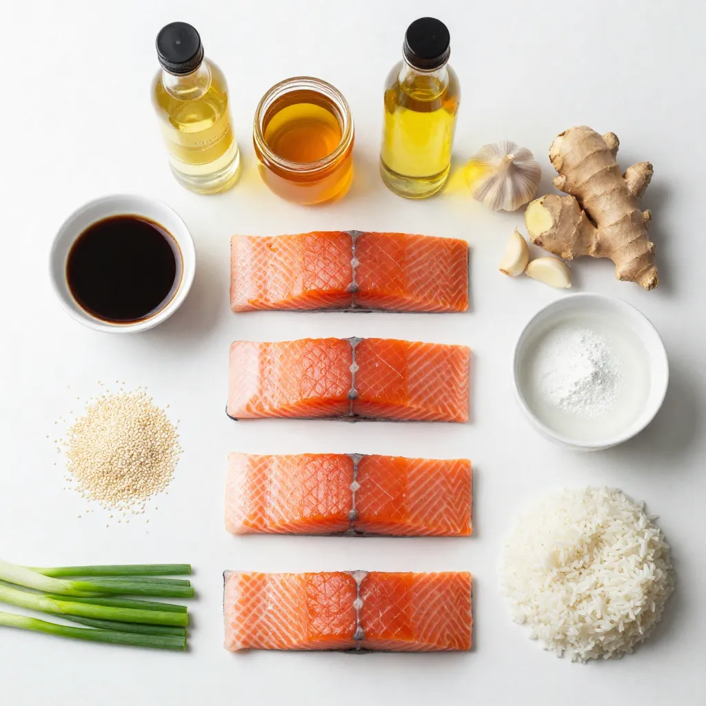 - 4 salmon fillets (6 oz each) - 1/4 cup low-sodium soy sauce - 2 tablespoons honey - 1 tablespoon rice vinegar - 1 tablespoon sesame oil - 2 garlic cloves, minced - 1 teaspoon fresh ginger, finely grated - 1 tablespoon cornstarch mixed with 2 tablespoons water (cornstarch slurry) - 1 tablespoon sesame seeds, toasted - 2 green onions, finely chopped - Cooked rice for serving When preparing teriyaki glazed salmon, use fresh ingredients for the best taste. The salmon fillets should be about 6 ounces each. Low-sodium soy sauce adds flavor without too much salt. Honey gives a natural sweetness. Rice vinegar adds a nice tang. Sesame oil brings warmth and aroma. Minced garlic and grated ginger enhance the dish’s depth. The cornstarch slurry thickens your glaze, making it sticky and perfect for salmon. To finish, toasted sesame seeds and chopped green onions add crunch and color. Serve over cooked rice, which soaks up the extra glaze. Preparation takes about 10 minutes, and cooking takes about 10 minutes, making a total of 20 minutes. This recipe serves four people. Enjoy this delicious dish with friends or family! {{ingredient_image_2}} 1. In a small saucepan, combine: - 1/4 cup low-sodium soy sauce - 2 tablespoons honey - 1 tablespoon rice vinegar - 1 tablespoon sesame oil - 2 minced garlic cloves - 1 teaspoon finely grated ginger 2. Heat this mix over medium heat. Whisk gently to blend all the flavors. 3. When it simmers, let it cook for 2-3 minutes. This helps the flavors mix well. 4. Gradually stir in 1 tablespoon of cornstarch mixed with 2 tablespoons of water. 5. Whisk continuously until the sauce thickens. It should be syrupy. 6. Remove from heat and let it cool for a bit. 1. Preheat your grill or grill pan to medium-high heat. This helps get a good sear. 2. Prepare 4 salmon fillets, each about 6 oz. 3. Generously brush the cooled teriyaki glaze on each salmon fillet. Reserve some glaze for later. 4. Place the salmon fillets skin-side down on the grill. 5. Grill for 4-5 minutes. Then, gently flip the fillets. 6. Continue grilling for another 3-4 minutes. The salmon is done when it turns opaque and flakes easily. 1. During the last minute of grilling, brush on a little more glaze. This adds flavor and shine. 2. Once cooked, remove the salmon from the grill. 3. Sprinkle with toasted sesame seeds and finely chopped green onions. This adds crunch and freshness. 4. Serve the teriyaki glazed salmon over fluffy cooked rice. Drizzle extra glaze on top for a tasty finish. Simmering the glaze is key. It helps all the flavors mix well together. When you simmer, the heat draws out the tastes. You want a rich, full flavor. If you find the glaze too sweet, add a splash of soy sauce. For a sweeter taste, stir in a bit more honey. Taste it often. This way, you can adjust until it’s just right. To get those great grill marks, make sure your grill is hot. Preheat your grill to medium-high heat. Place the salmon skin-side down first. Press gently to make good contact with the grill. This helps it sear nicely. Salmon can cook fast, so watch it closely. You want it to be opaque and flake easily with a fork. If you overcook it, it can dry out. Pair your teriyaki glazed salmon with rice. White, brown, or jasmine rice works well. The rice soaks up the glaze and adds flavor. You can also add some fresh veggies on the side. Steamed broccoli or sautéed bok choy complement the salmon perfectly. They add color and nutrition to your meal. Pro Tips Marinate for Extra Flavor: Allow the salmon to marinate in the teriyaki glaze for at least 30 minutes before grilling. This enhances the flavors and ensures a deliciously rich taste. Perfect Grill Temperature: Preheat your grill to medium-high heat. This ensures a nice sear on the salmon while keeping it moist and tender inside. Use Fresh Ingredients: Whenever possible, use fresh garlic and ginger. They provide a more vibrant flavor compared to dried alternatives, elevating your teriyaki glaze. Garnish for Visual Appeal: Don't skip the sesame seeds and green onions! They add both crunch and a pop of color, making your dish visually appealing as well as delicious. {{image_4}} You can swap salmon for chicken or tofu. Use skinless chicken breasts or firm tofu. For chicken, cook for about 6-7 minutes per side. For tofu, grill for 4-5 minutes per side. Adjust the grilling time based on thickness. This way, you still enjoy that tasty teriyaki flavor. Add some spices or herbs for extra flavor. Try garlic powder, red pepper flakes, or black pepper. Fresh herbs like cilantro or basil can brighten up the dish. You can also grill some veggies alongside the salmon. Bell peppers, zucchini, or broccoli work well. They add color and nutrition to your meal. You can bake the salmon in the oven. Preheat your oven to 400°F (200°C). Place the salmon on a baking sheet lined with parchment paper. Bake for 12-15 minutes. Keep an eye on the salmon; it should be opaque and flake easily. If you prefer stovetop cooking, pan-sear the salmon. Heat a non-stick skillet over medium-high heat. Add a bit of sesame oil before placing the salmon in the pan. Cook for about 4-5 minutes per side. This method gives you a nice crust and keeps the fish juicy. To store leftover salmon, place it in an airtight container. Make sure it cools down first. You can also wrap it tightly in plastic wrap. This keeps the fish fresh. In the fridge, teriyaki glazed salmon lasts for 3 to 4 days. Freezing teriyaki glazed salmon is simple. First, wrap each fillet in plastic wrap. Then, place them in a freezer bag or container. Make sure to squeeze out any air. This helps prevent freezer burn. Salmon can stay frozen for up to 3 months. When you're ready to eat, thaw it in the fridge overnight. To reheat, place it in the oven at 350°F until warmed through. You can get creative with leftover salmon! Try flaking it into salads for a tasty boost. It also works great in sandwiches. Add it to a soft roll with greens and a bit of 