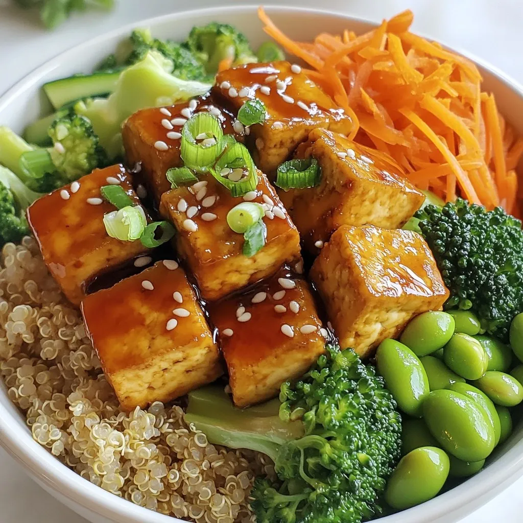 Now, it’s time to assemble your power bowls. Start with a base of cooked quinoa or brown rice in each bowl. Layer the steamed broccoli, shredded carrots, and edamame on top. Finally, add the teriyaki tofu pieces. Don’t forget to garnish with sliced green onions and sesame seeds. If you want some heat, serve with Sriracha sauce on the side.