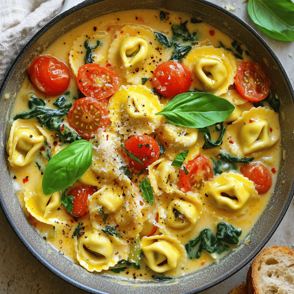 - 12 oz fresh cheese tortellini - 1 cup cherry tomatoes, halved - 1 cup fresh spinach leaves, roughly chopped Fresh cheese tortellini brings a rich flavor. You can find it in the pasta aisle. Cherry tomatoes add a sweet burst. Halving them helps release their juices. Spinach leaves provide a vibrant color and healthy crunch. This mix makes a great base for our dish. - 1 tablespoon extra virgin olive oil - 1 teaspoon dried Italian seasoning - 1/4 teaspoon red pepper flakes (or to taste) Extra virgin olive oil gives depth. It also helps the garlic cook evenly. Dried Italian seasoning adds classic flavors. Red pepper flakes add heat. You can adjust them based on your taste. - 1/2 cup heavy cream - 1/2 cup freshly grated Parmesan cheese Heavy cream makes the sauce rich and smooth. It blends well with the other ingredients. Parmesan cheese adds a salty, nutty flavor. Grating it fresh also gives the best taste. Together, they create a creamy sauce that coats the tortellini perfectly. - First, warm 1 tablespoon of extra virgin olive oil in a large skillet over medium heat. - Once the oil is hot, add 3 cloves of finely minced garlic. Sauté for about 1 minute until golden and aromatic. - Next, add 1 cup of halved cherry tomatoes to the skillet. Cook them for about 3 to 4 minutes. You want them to soften and release their juices. - Once the tomatoes have softened, stir in 1 cup of roughly chopped spinach leaves. Cook for another 1 to 2 minutes until the spinach wilts and brightens. - After that, sprinkle in 1 teaspoon of dried Italian seasoning and 1/4 teaspoon of red pepper flakes. Season with sea salt and freshly ground black pepper to taste. Mix everything to blend the flavors. - Now, it’s time to add the fresh cheese tortellini. Gently stir to coat them in the mixture. Pour in 1/2 cup of heavy cream and bring it to a gentle simmer. - Allow the dish to cook for 5 to 7 minutes. Stir occasionally until the tortellini is tender. Finally, fold in 1/2 cup of freshly grated Parmesan cheese. Let it melt into a creamy sauce. - Taste the mixture and adjust the seasoning if needed. Remove the skillet from heat and garnish with fresh basil leaves before serving. To ensure your tortellini is perfectly cooked, follow these steps: - Use fresh tortellini: Fresh cheese tortellini cooks in just 5-7 minutes. - Taste as you cook: Check for tenderness before removing from heat. - Avoid overcooking: Too much time in the skillet makes it mushy. Adjusting seasoning to your taste is key. Here’s how: - Start small: Add a pinch of sea salt and black pepper first. - Taste often: After each addition, taste to find your perfect flavor. - Spice it up: If you love heat, add more red pepper flakes gradually. Serving suggestions can elevate your dish. Here are my favorites: - Shallow bowls: Serve tortellini in shallow bowls for a nice look. - Extra Parmesan: Top with more grated Parmesan for flavor and style. - Fresh basil: Add a few leaves for color and aroma. Ideal drink pairings enhance the meal. Consider: - White wine: A light white wine complements the creamy sauce beautifully. - Sparkling water: A refreshing sparkling water balances the richness. The right tools make cooking easier. Here’s what you need: - Large skillet: A non-stick or cast-iron skillet works best for even cooking. - Wooden spoon: Use it to stir and combine ingredients without scratching your skillet. - Measuring cups and spoons: Precise measurements help achieve the best flavor. {{image_4}} You can swap out ingredients in this dish to match your taste. Here are some ideas: - Using different vegetables: Try bell peppers, zucchini, or broccoli instead of spinach. Each adds a fresh flavor. - Alternative protein additions: Add cooked chicken, shrimp, or sausage for extra protein. These options can make the meal heartier. If you have specific dietary needs, this recipe can adjust easily: - Making it vegetarian or vegan: Use plant-based cream and cheese. You can replace tortellini with a vegan option. This keeps the dish tasty and meat-free. - Gluten-free options: Look for gluten-free tortellini at the store. You can also use rice or quinoa instead of tortellini for a gluten-free base. Boost the taste of your Tuscan Tortellini Skillet with these additions: - Adding spices or herbs: Include fresh herbs like oregano or thyme. A pinch of smoked paprika can add depth and warmth. - Incorporating additional cheeses: Use mozzarella or feta alongside Parmesan. This gives your dish a rich and creamy texture. These variations let you customize your Tuscan Tortellini Skillet. You can make it fit your taste or dietary needs while keeping it fun and delicious! To keep your Tuscan Tortellini Skillet fresh, store it in the fridge. Place it in an airtight container. This helps to avoid moisture loss and keeps the flavors intact. Use the leftovers within three days for the best taste. - Best practices for refrigeration: - Let the dish cool down to room temperature. - Avoid leaving it out for more than two hours. - Label your container with the date. - Storing tips for prolonging freshness: - Keep the Parmesan cheese separate if possible. - Refrain from mixing in extra ingredients until you reheat the dish. Reheating is easy and quick. You want to warm it up without losing flavor. Use medium heat on the stove or the microwave for fast options. - Methods for reheating without losing flavor: - Heat on the stove with a splash of water or cream. - Stir often to avoid burning. - Quick reheating options: - Use the microwave. Heat in short bursts, stirring in between. - Cover the dish with a damp paper towel to keep moisture. Freezing is great for long-term storage. It lets you enjoy this meal later. However, some textures may change. - Freezing instructions for long-term storage: - Cool the dish completely. - Place it in a freezer-safe container. - Leave some space at the top for expansion. - Thawing and reheating after freezing: - Thaw in the fridge overnight before reheatin
