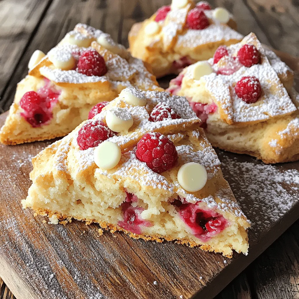 These ingredients blend together to create a rich, flavorful base for the scones. The combination of fresh raspberries and white chocolate gives a sweet and tangy taste that everyone loves.