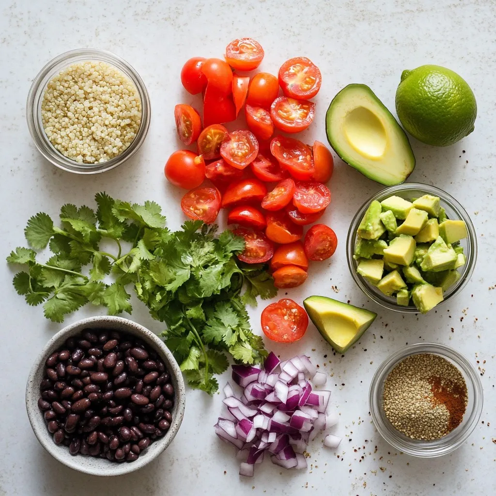 Having fresh ingredients is key to making this salad shine. Quinoa is the base of this dish. It adds a nutty flavor and lots of protein. Black beans bring in fiber and texture. The cherry tomatoes and red bell pepper add bright colors and sweetness. Red onion gives a nice crunch and a bit of bite. Avocado adds creaminess. Fresh cilantro adds a pop of flavor that makes the salad sing.