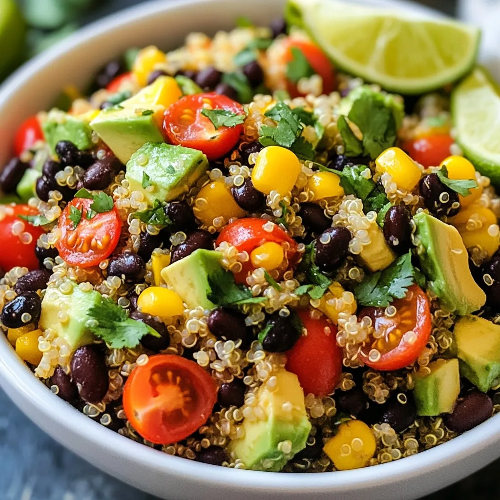 To make your Zesty Quinoa Black Bean Salad, gather the following ingredients: - 1 cup quinoa, thoroughly rinsed - 2 cups vegetable broth (or water) - 1 can (15 oz) black beans, drained and rinsed - 1 cup cherry tomatoes, halved - 1 red bell pepper, diced into bite-sized pieces - 1 small red onion, finely chopped - 1 ripe avocado, diced - 1/4 cup fresh cilantro, finely chopped - Juice from 1 lime - 3 tablespoons extra virgin olive oil - 1 teaspoon ground cumin - 1 teaspoon smoked paprika - Salt and freshly ground black pepper, to taste Having fresh ingredients is key to making this salad shine. Quinoa is the base of this dish. It adds a nutty flavor and lots of protein. Black beans bring in fiber and texture. The cherry tomatoes and red bell pepper add bright colors and sweetness. Red onion gives a nice crunch and a bit of bite. Avocado adds creaminess. Fresh cilantro adds a pop of flavor that makes the salad sing. Lime juice and extra virgin olive oil create a zesty dressing. Ground cumin and smoked paprika bring warmth to the dish. Lastly, salt and pepper enhance all the flavors. Once you have everything, you’re ready to make a fresh and flavorful salad! {{ingredient_image_2}} To cook quinoa, start by rinsing it well. Place the quinoa in a fine mesh strainer. Rinse it under cold water for about 2 minutes. This helps remove a bitter coating called saponin. After rinsing, drain it well. Next, add the rinsed quinoa to a medium saucepan. Pour in 2 cups of vegetable broth or water. Bring the mix to a boil over medium-high heat. Once it boils, reduce the heat to low and cover the pan. Let it simmer for about 15 minutes. You want the quinoa to absorb all the liquid. When it’s done, remove it from heat and let it cool. For fluffiness, fluff the quinoa with a fork before using it in the salad. Now, let’s prepare the salad. In a large mixing bowl, combine 1 can of black beans, drained and rinsed. Add 1 cup of halved cherry tomatoes, diced red bell pepper, and finely chopped red onion. Don’t forget the diced avocado! Gently mix these ingredients together to combine their fresh flavors. Once your quinoa has cooled to room temperature, add it to the vegetable mix. This adds a great texture and nutty taste to the salad. For the dressing, gather your ingredients. You will need juice from 1 lime, 3 tablespoons of extra virgin olive oil, 1 teaspoon of ground cumin, and 1 teaspoon of smoked paprika. Add a pinch of salt and pepper for flavor. In a small bowl, whisk these together. Use a whisk or fork to blend them well until the dressing is smooth. This will give the dressing a bright and zesty flavor. Now it’s time for the final assembly! Drizzle the dressing over the quinoa salad. Toss the salad gently but thoroughly. Make sure every ingredient gets coated with that yummy dressing. Just before serving, fold in about 1/4 cup of finely chopped cilantro. This adds freshness and a pop of color to your dish. Enjoy your zesty quinoa black bean salad! To boost the flavor of your Zesty Quinoa Black Bean Salad, try adding spices. A pinch of chili powder can add a kick. You can also sprinkle in some garlic powder for extra zest. If you enjoy heat, add diced jalapeños for a spicy twist. You can also play with vegetables. Add corn for sweetness or diced cucumbers for crunch. Shredded carrots can add color and nutrition, too. Try adding radishes for a peppery bite. These changes keep the salad fresh and exciting. Serve your salad in a large, colorful bowl for a vibrant look. Individual portions in small bowls can impress guests. For a fun twist, layer the salad in a mason jar. This makes a great grab-and-go meal. Garnish your salad to make it pop. Add lime wedges around the bowl to enhance the visual appeal. A sprinkle of extra cilantro on top adds freshness. You can also use sliced avocados as a beautiful garnish. These tips will make your dish look as good as it tastes! Pro Tips Rinse Your Quinoa: Always rinse quinoa thoroughly before cooking to remove its natural coating, called saponin, which can give it a bitter taste. Cool Before Mixing: Allow the quinoa to cool to room temperature before adding it to the salad to prevent wilting the fresh ingredients. Fresh Herbs at the End: Add fresh herbs like cilantro just before serving to maintain their vibrant flavor and color. Customize Your Veggies: Feel free to swap in seasonal vegetables or whatever you have on hand; this salad is versatile and can be tailored to your taste. {{image_4}} You can make this salad heartier by adding protein. Grilled chicken works great. It adds a nice smoky flavor. If you want a plant-based option, try tofu. Just grill or sauté it until golden. You can also incorporate feta or cheese for creamy richness. Crumbled feta adds a tangy bite. Shredded cheese melts nicely and makes the salad more filling. If you want to change the taste, try different dressings. A balsamic vinaigrette can add a sweet twist. You can also use a spicy dressing for more heat. Switching beans or grains can change this salad’s vibe. Chickpeas or kidney beans work well. For grains, try farro or barley instead of quinoa. Each swap brings a new flavor and texture. To store leftovers of your zesty quinoa black bean salad, place it in an airtight container. Make sure the salad has cooled before sealing. This helps keep it fresh. The salad stays good in the fridge for about 3 to 5 days. If you notice any signs of spoilage, like a strange smell or color change, throw it away. You can freeze this salad, but there are some things to keep in mind. Freezing can change the texture of some ingredients like avocado and tomatoes. I recommend not freezing the whole salad. Instead, separate the cooked quinoa and beans from the fresh veggies. To freeze the quinoa and beans: - Place them in a freezer-safe bag or container. - Make sure to remove as much air as possible. For avocado, try to freeze it in small pieces. This helps it stay safe for later use. When you are read